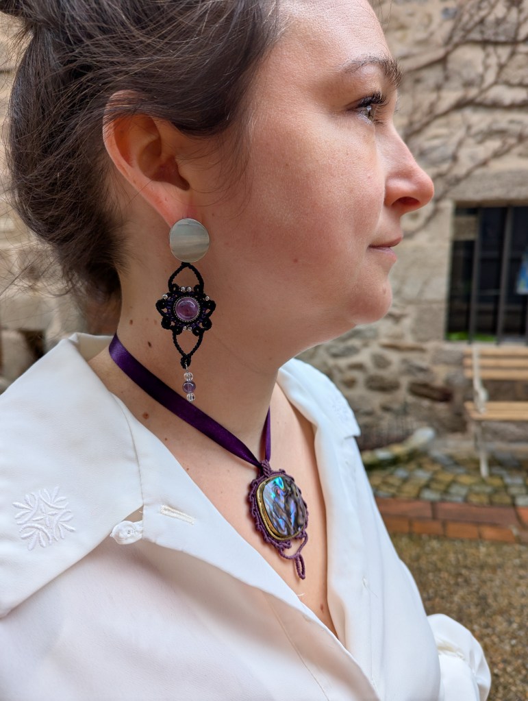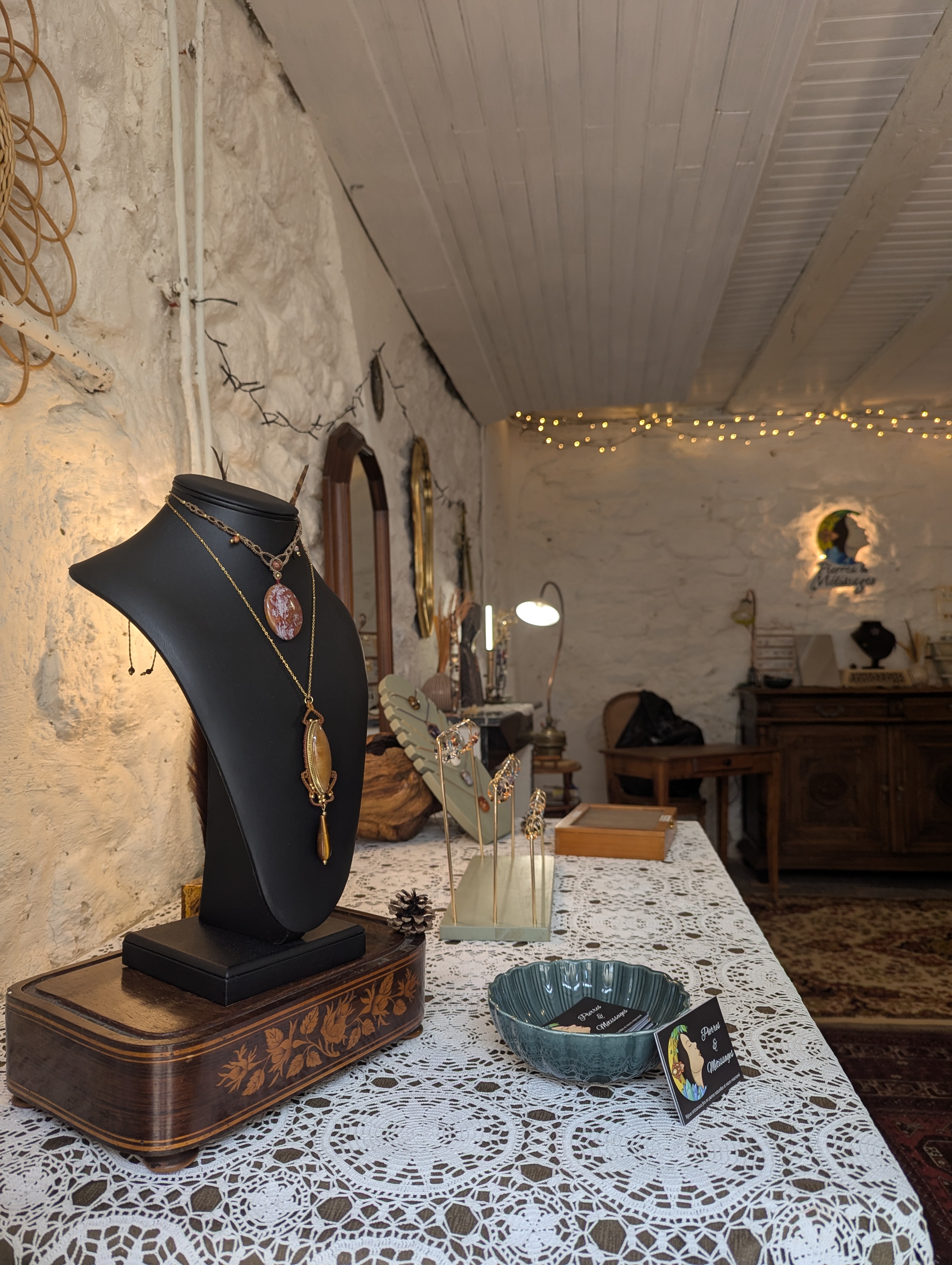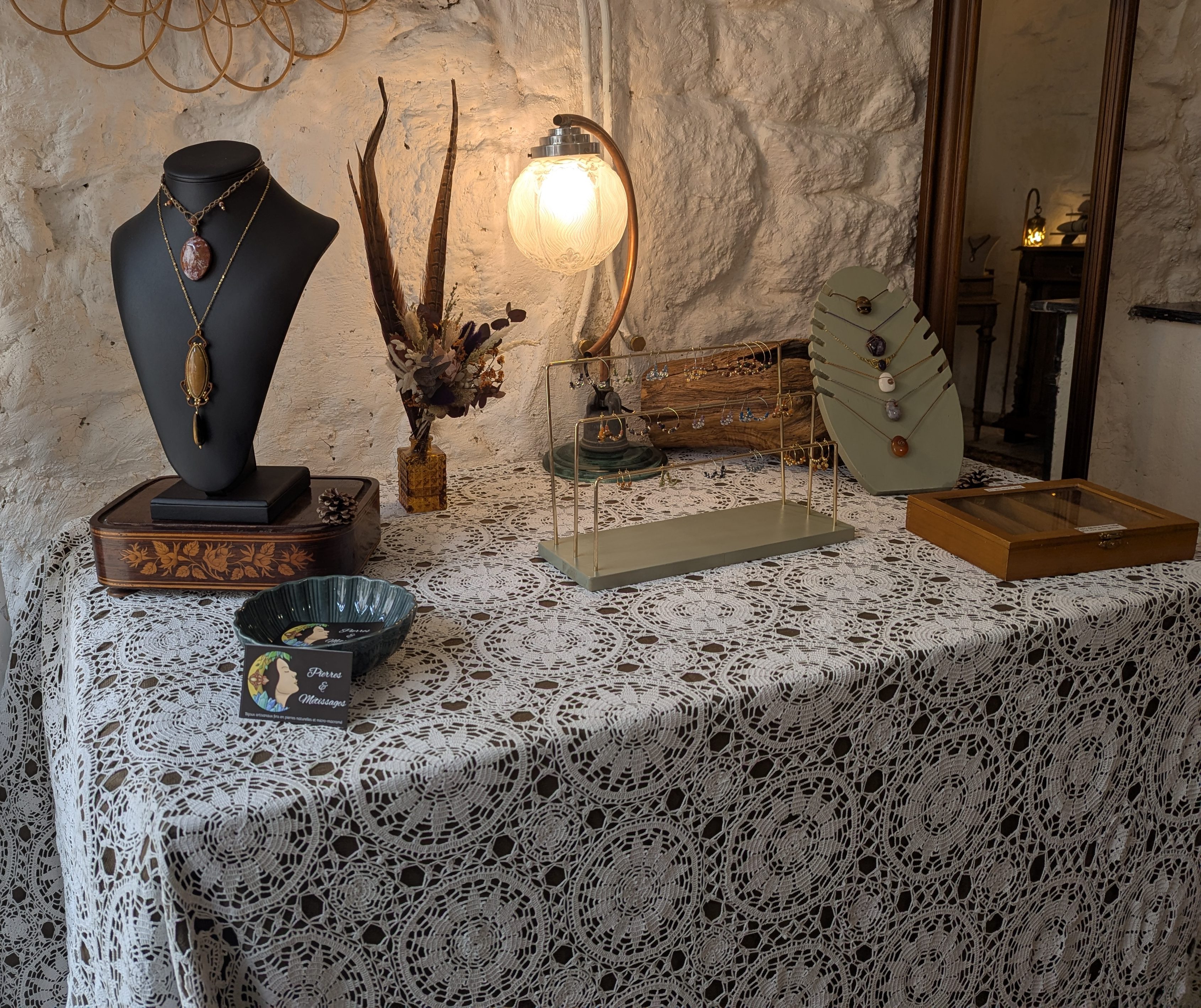 Pierres et métissages est un mélange entre le travail des minéraux et d’autres matériaux. En effet, j’ai été entourée dès mon plus jeune âge par les matières, les tissus, les textures mais aussi beaucoup par les objets anciens. Mes créations se situent entre style baroque et moderne. Ainsi, à l’image de la nature, mes créations sont plurielles.